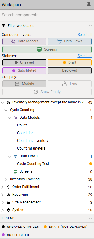 The new Workspace panel uses a tree to group application components; by default, it's organized by module, but that can be changed if needed. The filter section provides quick filters for component type and status; and within the tree, indicators provide information on component status (draft, substituted, etc.)