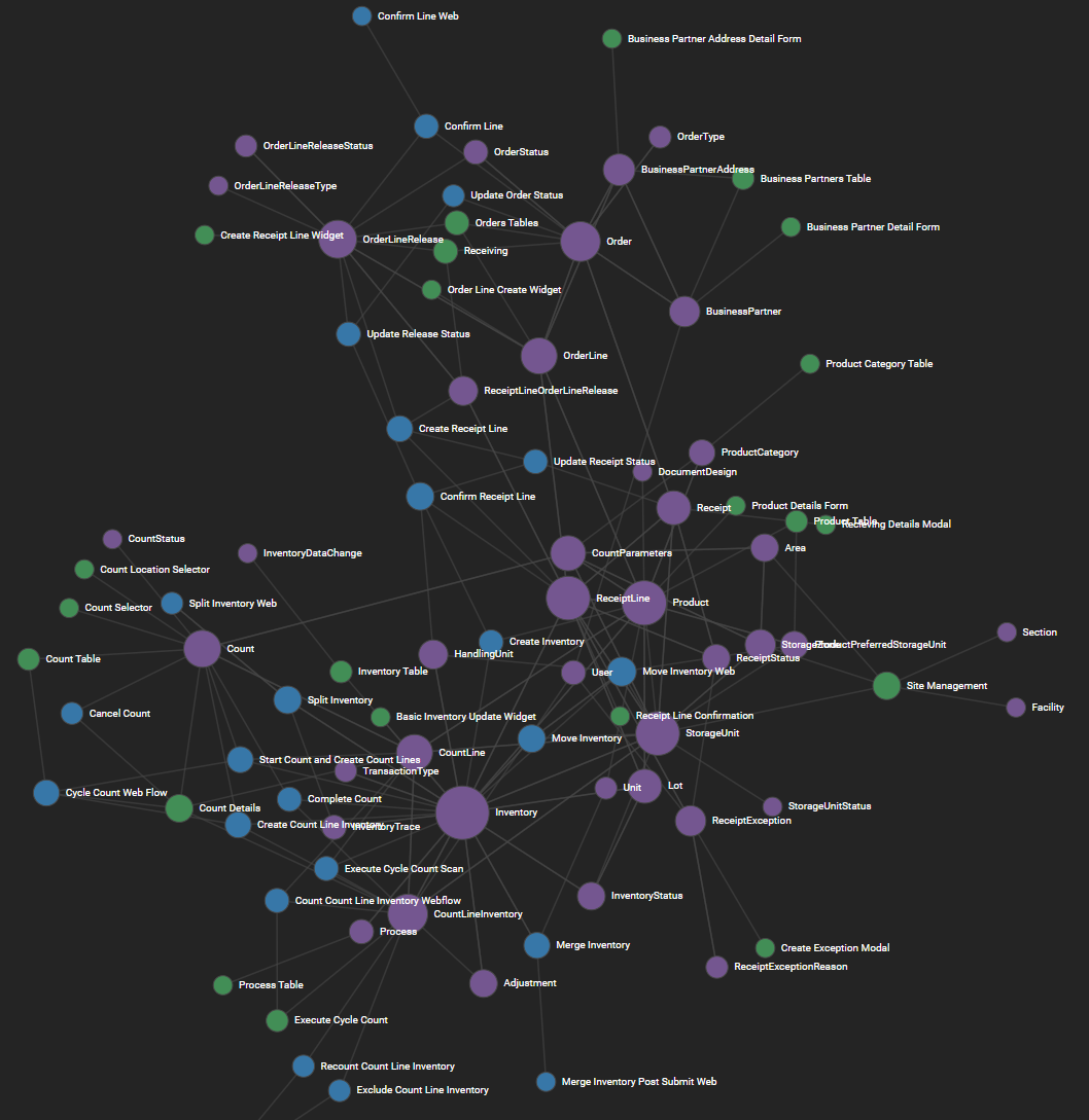 The most eye-catching feature this month is our brand new Application Graph - a visual way to view the complex web of relationships between the components (screens, flows, and data models) that comprise an app. In this view, each node is a component, color-coded by type - purple for data models, blue for data flows, and green for screens. Each link represents a reference - a place where one application component queries, executes, navigates to, or otherwise touches another. Nodes are scaled according to the number of relationships - the bigger the dot, the more important that node is to the application - and hovering over a node highlights it and any components it references.