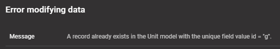 With this month's release, we've finally addressed an issue we've wanted to fix for years: duplicate key errors! If you've been using Fuuz for some time, you may be familiar with the cryptic "duplicate key error" messages which arose when unique indexes were violated (e.g. a user tried to create two records with the same name). Those errors have annoyed us from the very beginning, but we were handcuffed by the data returned to us by the MongoDB driver. Thankfully, after our recent updates to use a newly added client feature, we are finally able to format human-readable error messages for these cases - a huge improvement for the user experience in Fuuz, helping users identify what went wrong and how to address it. It's about time!