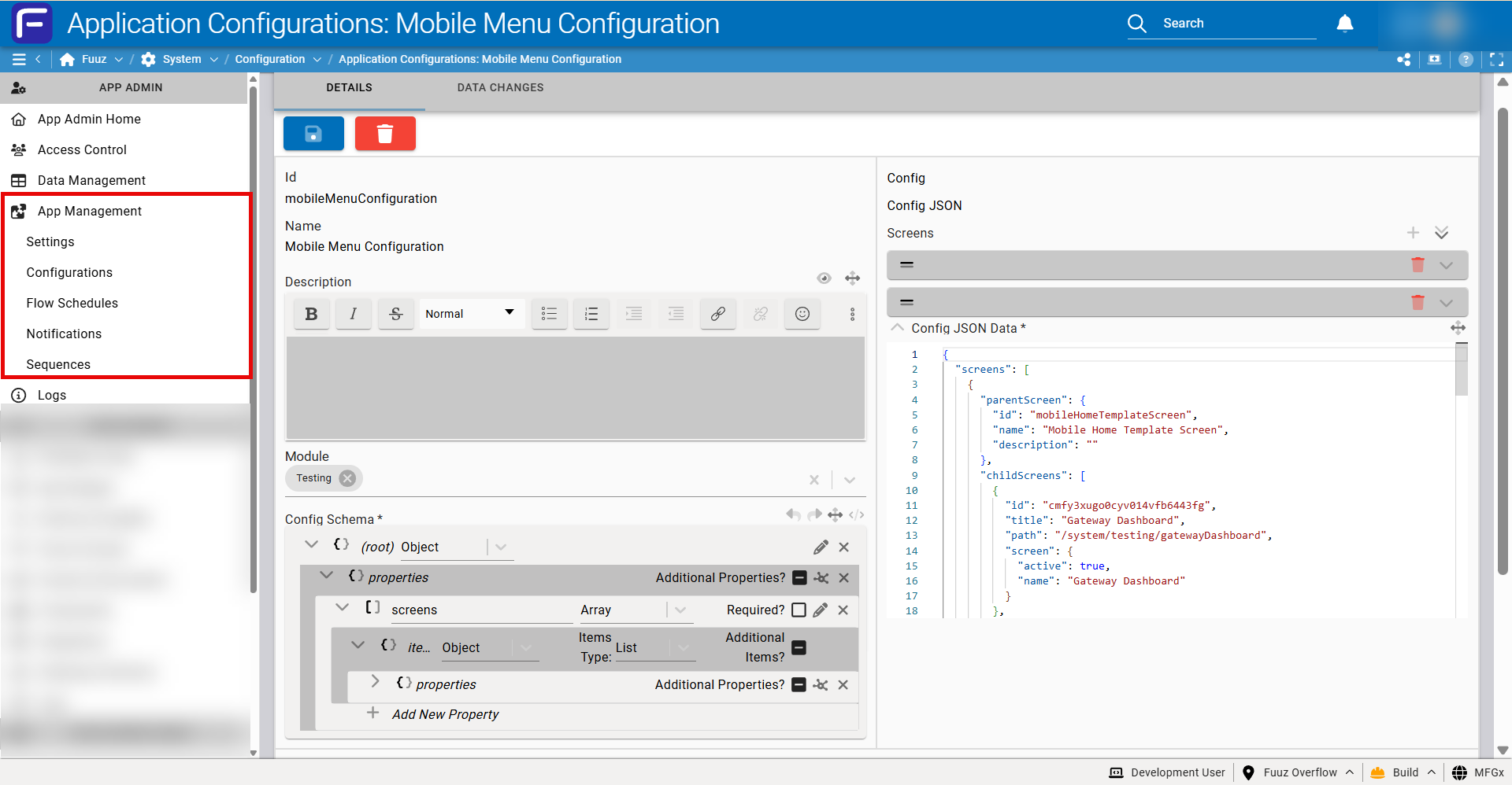 Application Configurations provide a flexible, schema-validated system for defining custom configuration data that extends beyond standard Application Settings. This feature enables App Administrators and Developers to create enterprise-grade solutions where business logic can be abstracted from application logic, allowing configuration changes in production environments without code deployment. Configurations support complex nested JSON structures with validated references to system and custom data models, making them ideal for multi-site deployments, dynamic workflows, and adaptable business rules.