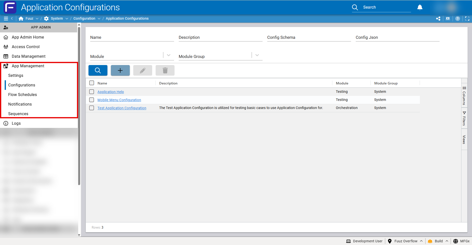 The Application Configurations screen is accessed via App Management > Configurations in the App Admin menu section.