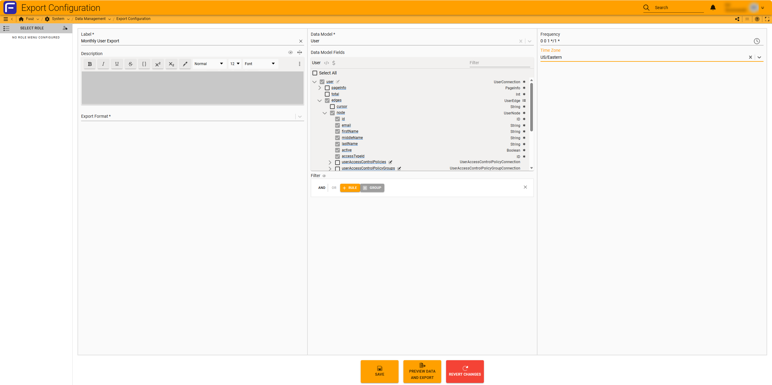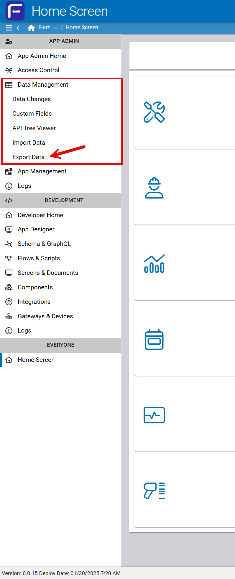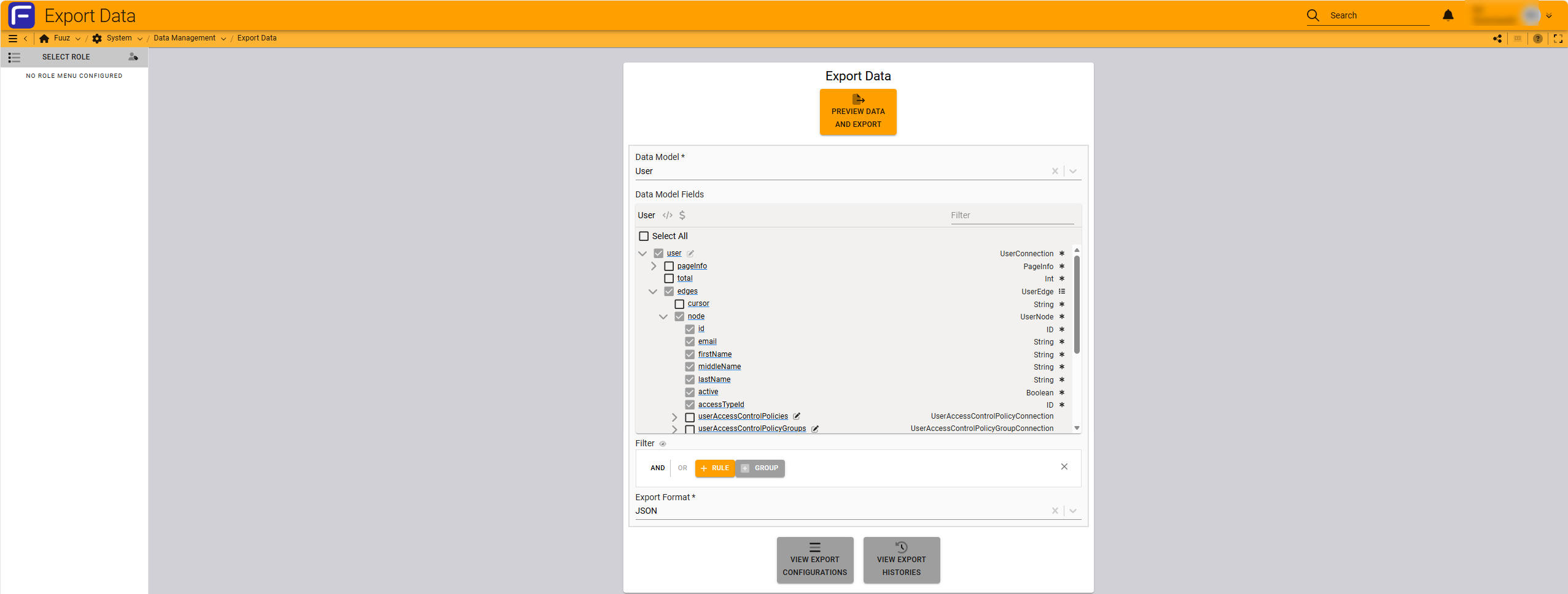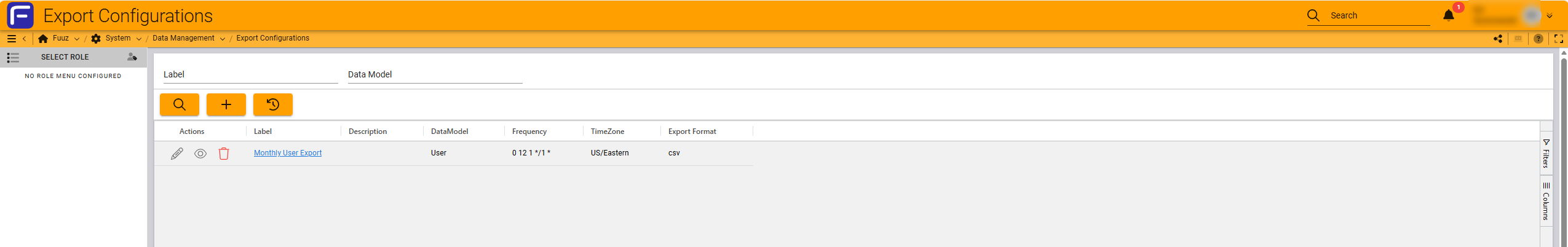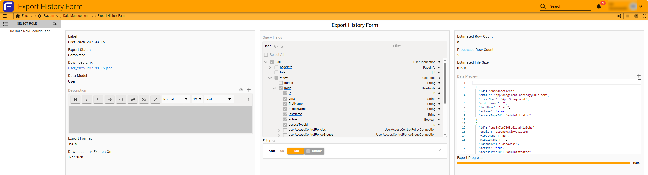 The Export Data feature was introduced in the Fuuz 2025.5 release. It provides an easy way to export data from Fuuz into different formats. Supported formats include CSV and JSON. Exports can be ad hoc or based on reusable Export Configurations.