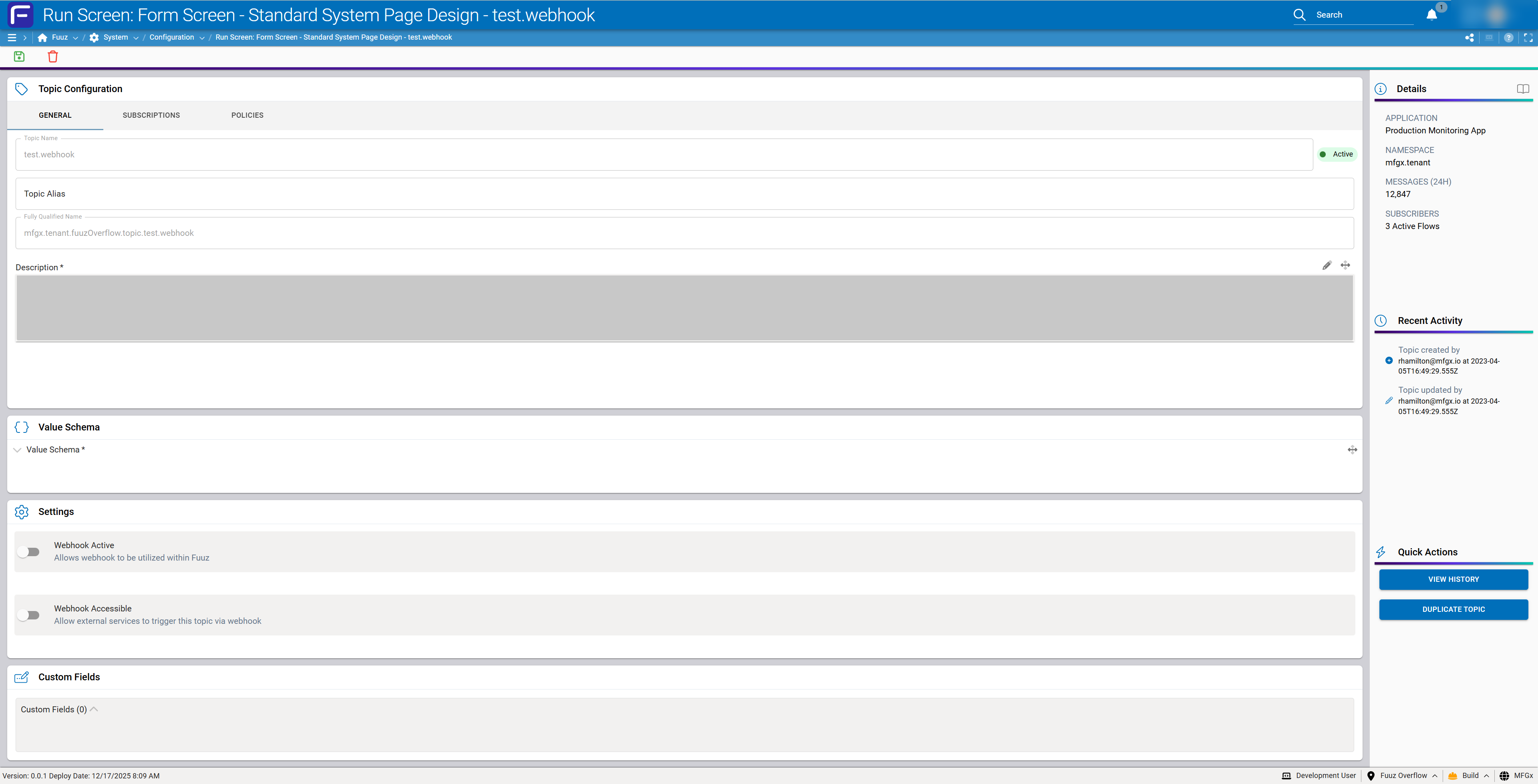 Form_Screen_-_Standard_System_Page_Design_0_0_1.jsonThe Standard Form Design defines a consistent screen architecture for viewing and editing individual records within Fuuz applications. It establishes patterns for layout, component organization, and interaction behaviors that apply universally across MES, WMS, QMS, Asset Management, and custom industrial applications.