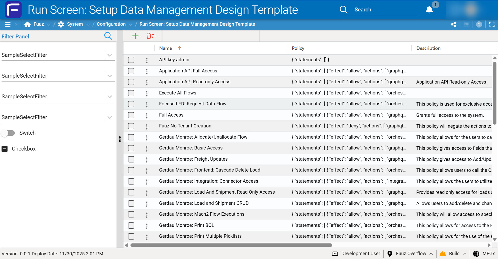 This specification provides guidance for designing and implementing a "Table Screen" in Fuuz for managing setup data. Setup Data Management (SDM) focuses on administrative entities such as types, statuses, groups, and categories. These are typically restricted to administrators and are used by end users to configure master data elements or transactions within the system. The template is derived from a JSON configuration (version 0.0.1) built using Fuuz's Application Designer, which prioritizes a resizable filter panel, a streamlined top action bar for essential CRUD operations, and a data table with core and audit columns.
