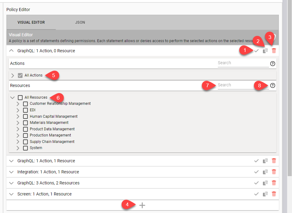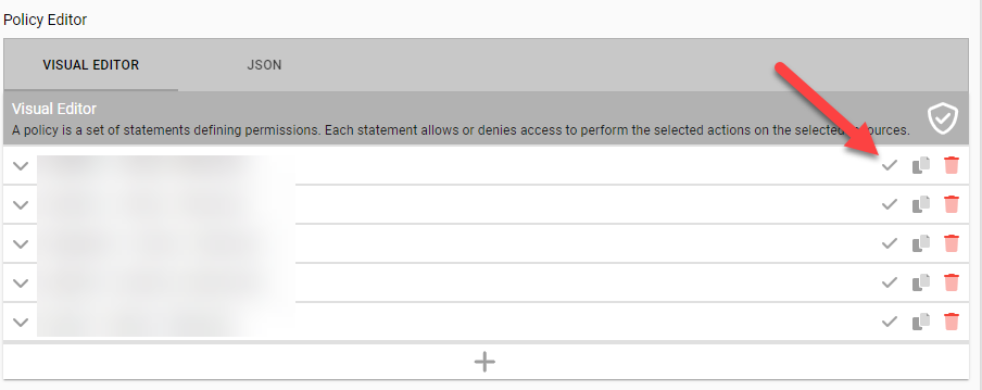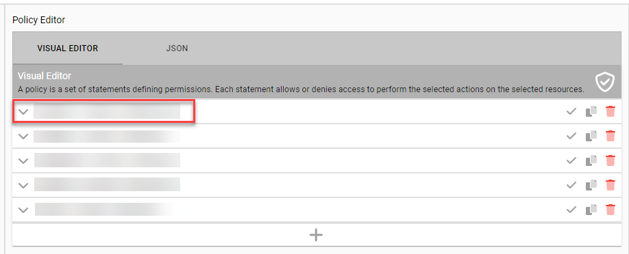 Alternately, modify existing statements in the Visual Editor tab of the Policy Editor.