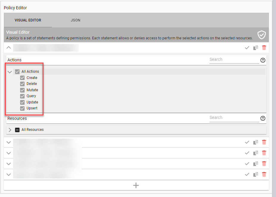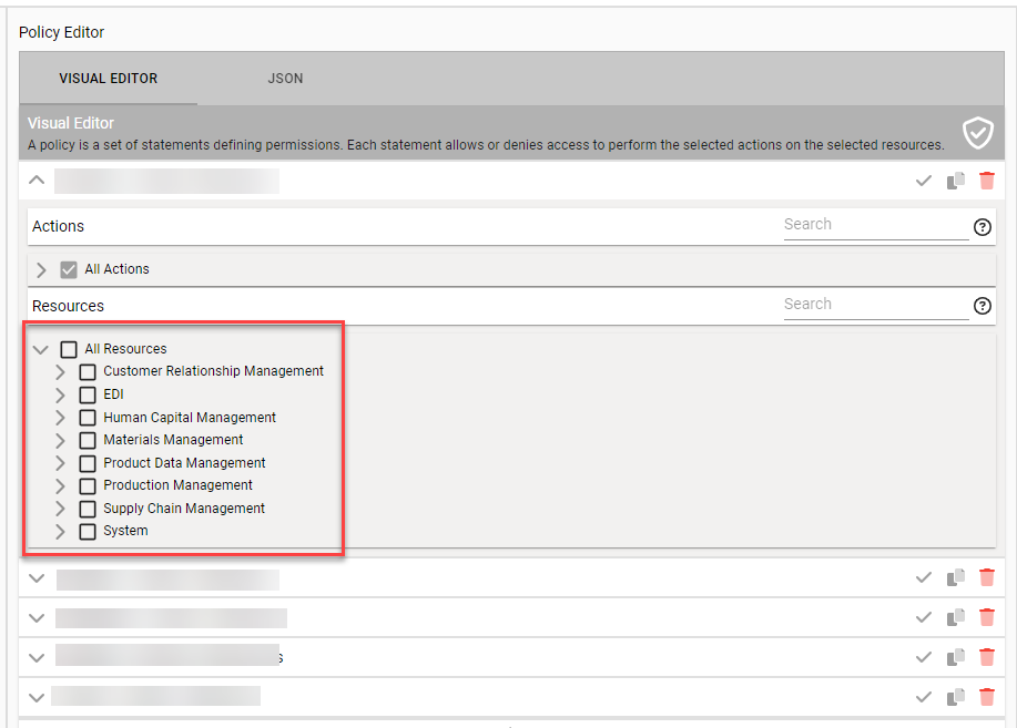 - Use the Search bar to search for particular action or resource.