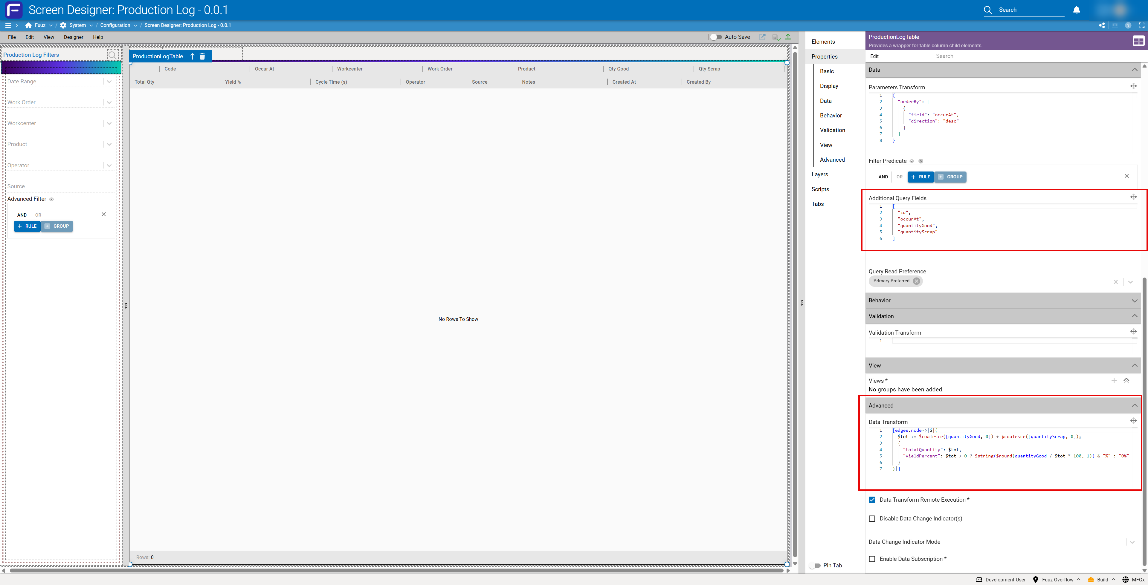 2. All fields used in the transform must be included in the Additional Query Fields. The transform executes after the GraphQL query returns data. If your transform references fields not included in the query, those fields will be undefined and calculations will fail.