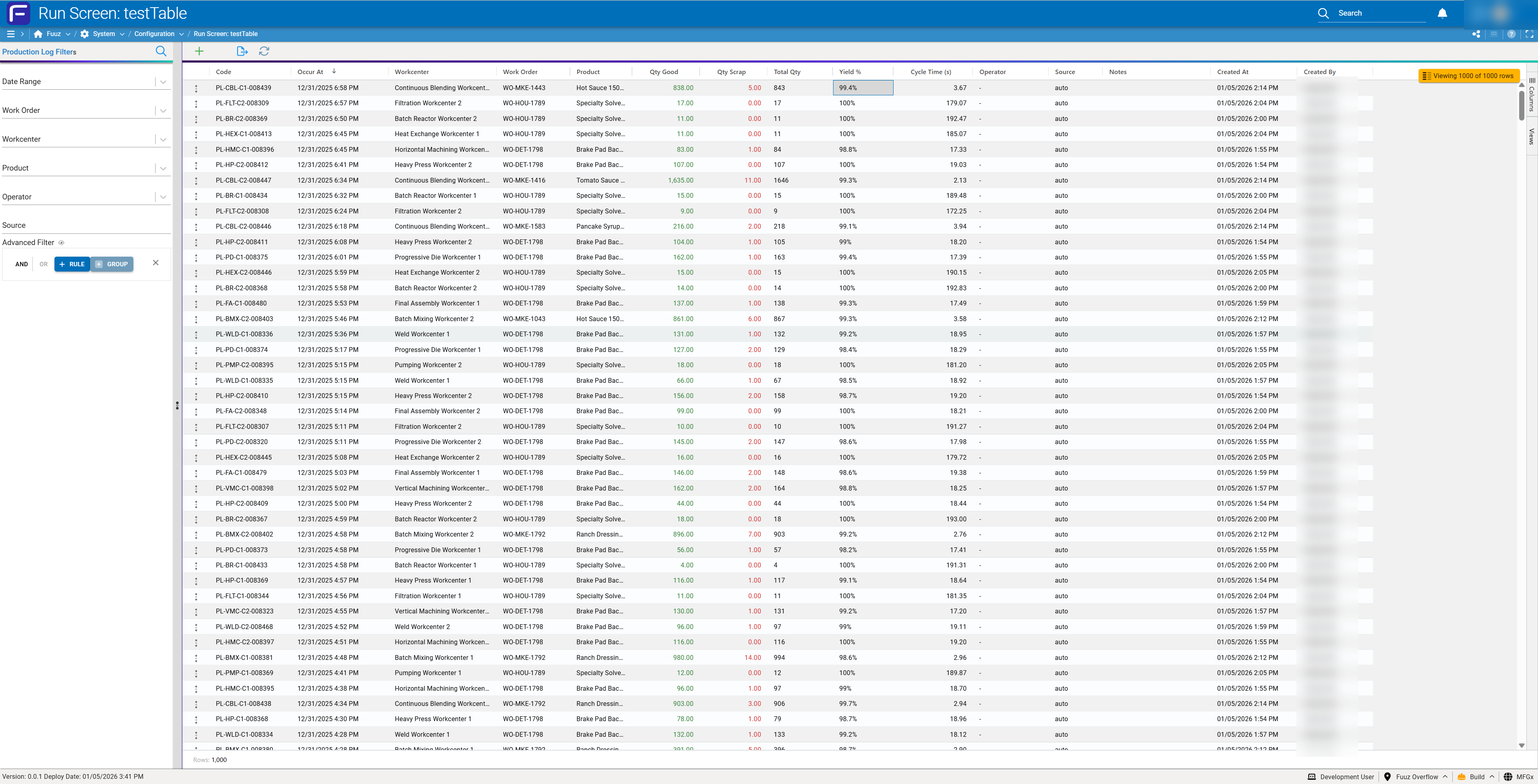 - Production History: Completed production runs, output quantities, yield rates, cycle times, quality metrics