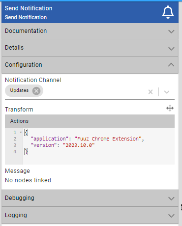 Transform: A JSONata transform. The results of this transform is the payload that will be used when creating the message for the notification sent out. If the results are an array then multiple notifications will be sent out