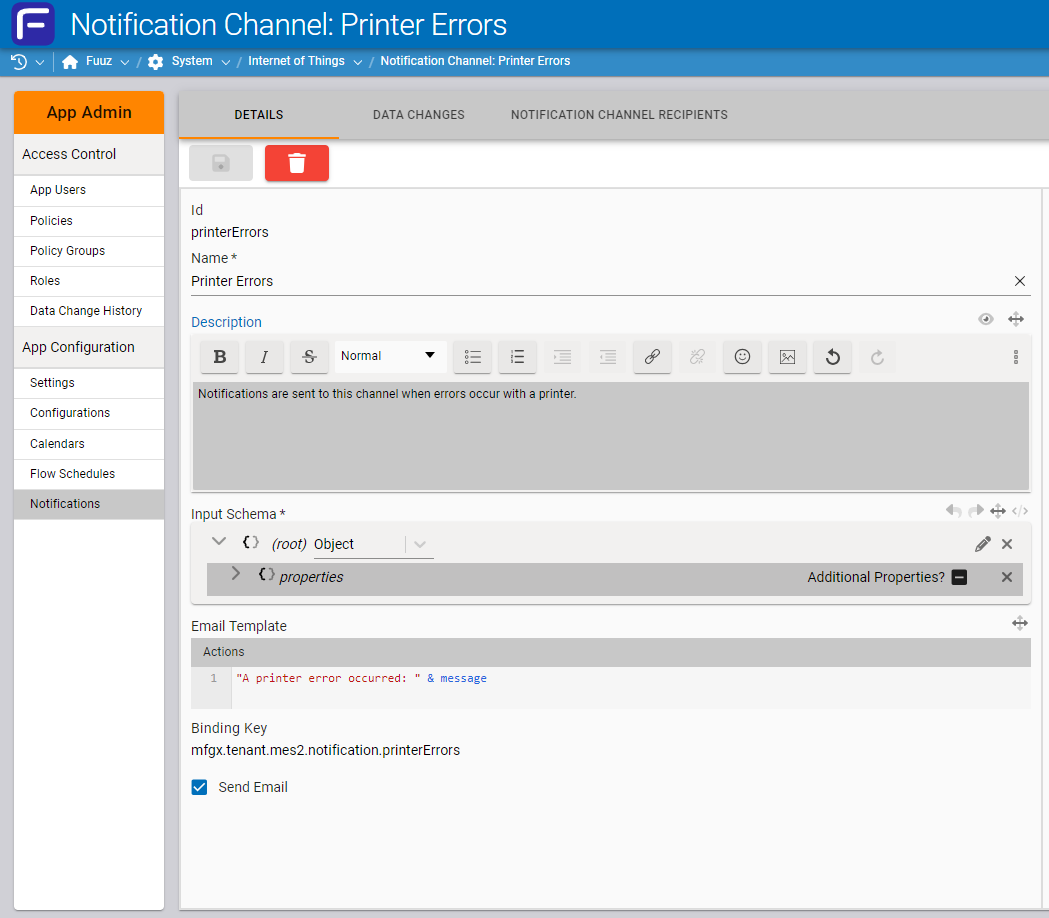 For example if we have data flow that sends zpl label to a printer. If the printer is disconnected the data flow will error. We can create a Notification Channel for printer errors and then add all the recipients that should know that the printer did not receive the label. Then the data flow can be updated to catch the error and send a message to that notification channel.