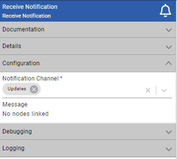 A node used to receive messages when notifications are sent out on a notification channel. If the sendEmail field is false on the notification channel Fuuz will not automatically send out emails but the Receive Notification Node will still receive the notifications. This can be used to implement custom notifications and custom transports