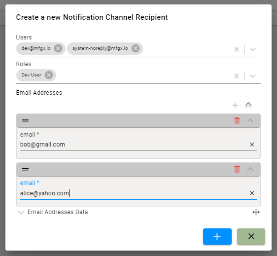 Email Addresses: A list of email addresses to send notifications to. These can be used for email addresses that are not related to a Fuuz user or configured in Fuuz.
