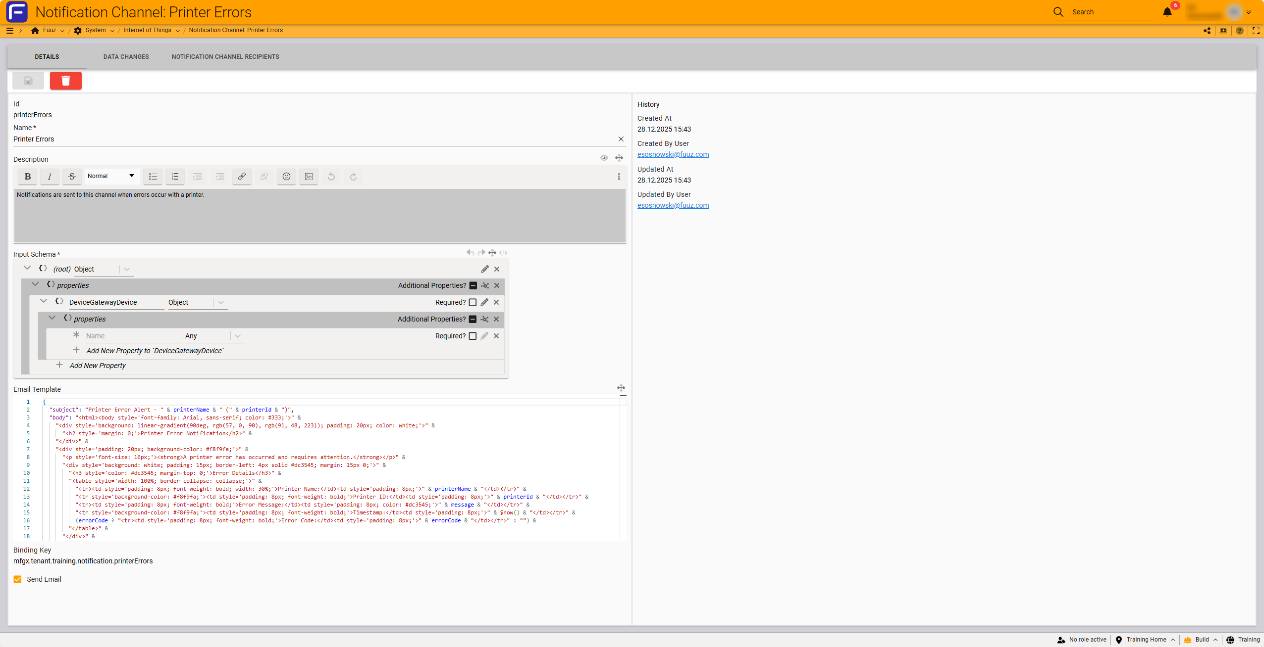 Notification Channels provide a centralized system for configuring and managing automated email notifications within the Fuuz platform. They enable your applications to send structured, branded email alerts when specific events occur, such as system errors, status changes, or process completions. By creating notification channels, you can establish reusable communication pathways that deliver consistent, well-formatted notifications to designated recipients.